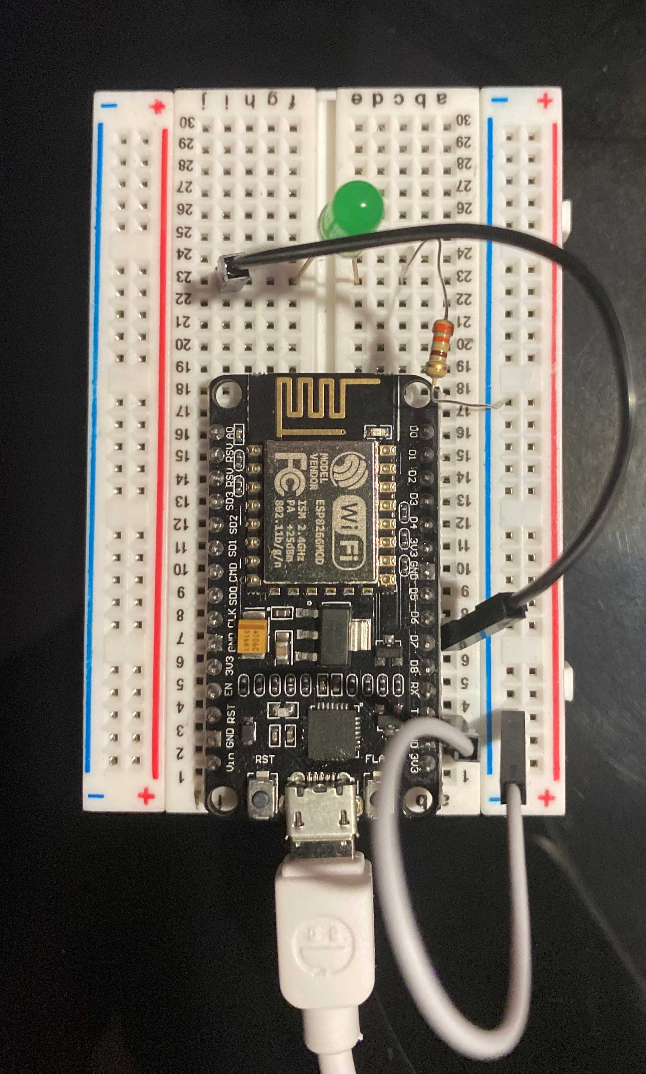 Place a second jumper wire from the D7 pin on the Node to the same row as the shorter prong of the LED. Finally, place your resistor between both jump wires and the corresponding prong on the LED. The resistor is used to control the flow of current to LED.