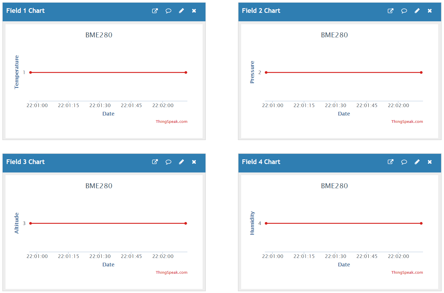 Again check the serial monitor to see if you connected to wifi and when the data is sent. It will take 60 seconds to send first and then send again every 60. You should see the points show up on your charts.